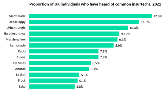 One of the main challenges insurtechs face is competing against well-established insurers that have been around for decades. Early brand recognition can certainly help insurtechs grow their customer base. Findings from GlobalData’s 2021 UK Insurance Consumer Survey highlight that Urban Jungle is one of the insurtechs most known by consumers, with 10.4% citing they had heard of the brand. Marmalade was the most recognized brand, 2.5 percentage points ahead of Urban Jungle. Nonetheless, the strong position of Urban Jungle compared to other insurtechs indicates that the company is creating a name for itself.