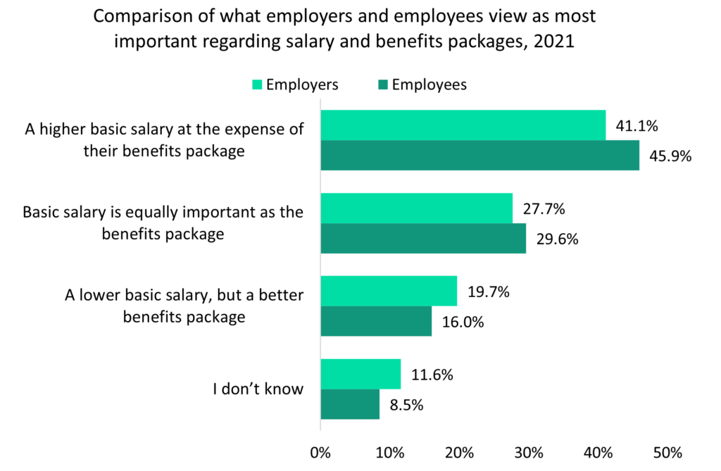 GlobalData’s 2021 UK Insurance Consumer Survey and 2021 UK SME Insurance Survey indicate that both employers and employees feel a higher basic salary is more important than a benefits package. 41.1% of employers recognize that employees put more significance on salary – slightly below the 45.9% of employees who value salary highest. As the cost-of-living crisis continues in the UK, more and more employees will put greater emphasis on a higher salary.