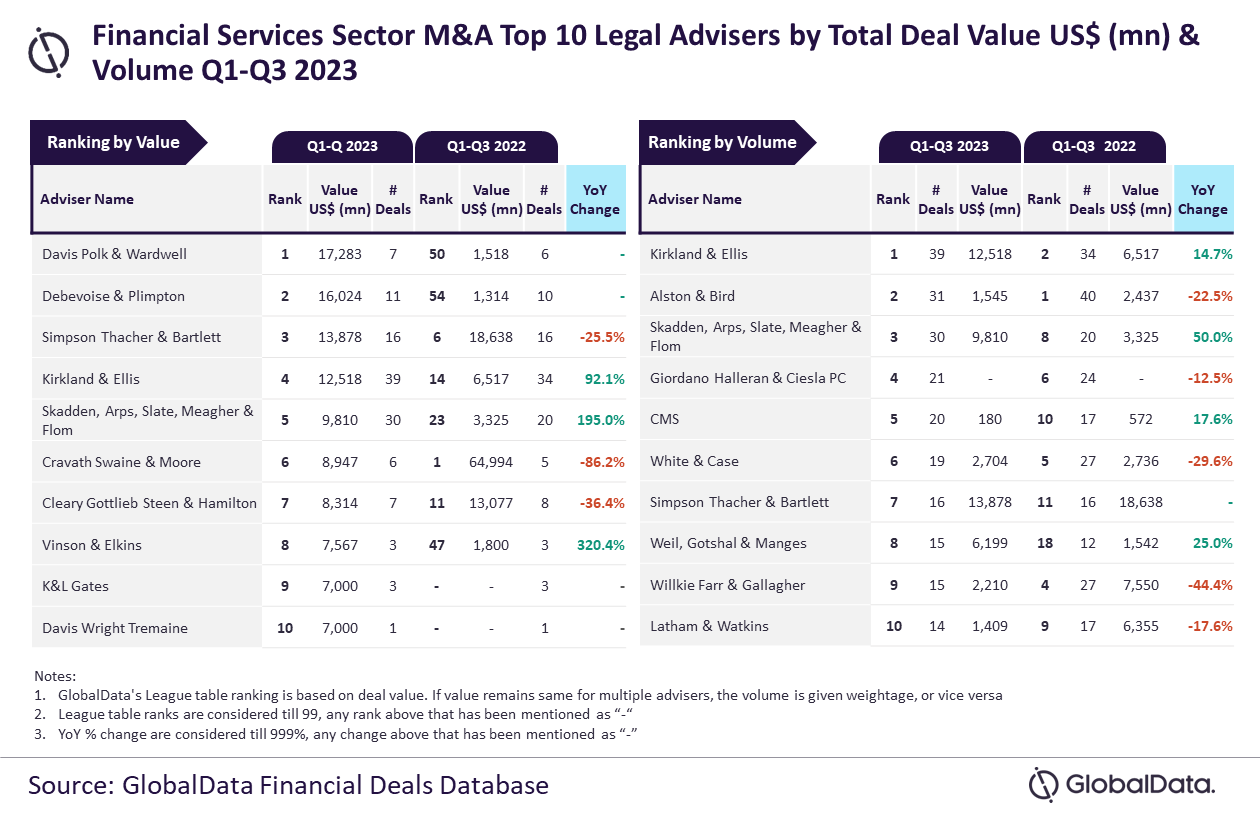 Wachtell, Lipton, Rosen & Katz and Kirkland & Ellis were the top M&A legal advisers in the financial services sector in Q1-Q3 2023, according to GlobalData’s ranking of leading M&A advisers.