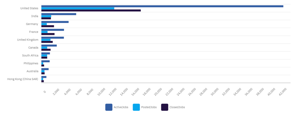 The top five was filled by Germany (4,784 active job postings), France (3,971) and the UK (3,948) with Europe having a strong showing this month. However, Germany was ahead of India in July 2023.