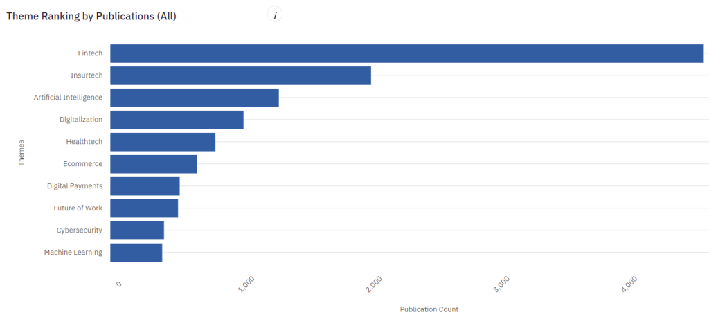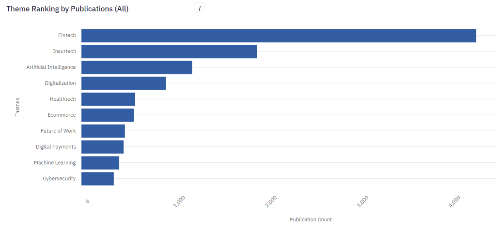Looking at the themes for the patents, fintech is clearly on everyone’s lips with 4,300 patents fitting in that space. Not so closely following is insurtech with 1,912 and artificial intelligence with 1,203.