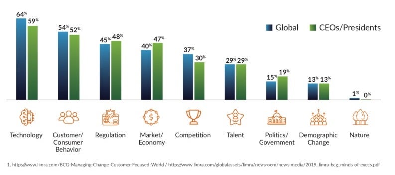 But change is coming, and the industry recognises this. A 2019 study of over 500 insurance C-suite executives by LIMRA and Boston Consulting Group¹ found technology was the most urgent external challenge affecting firms. 64 percent of executives cited it as the top issue in their firm, ahead of customer behaviour and regulation.