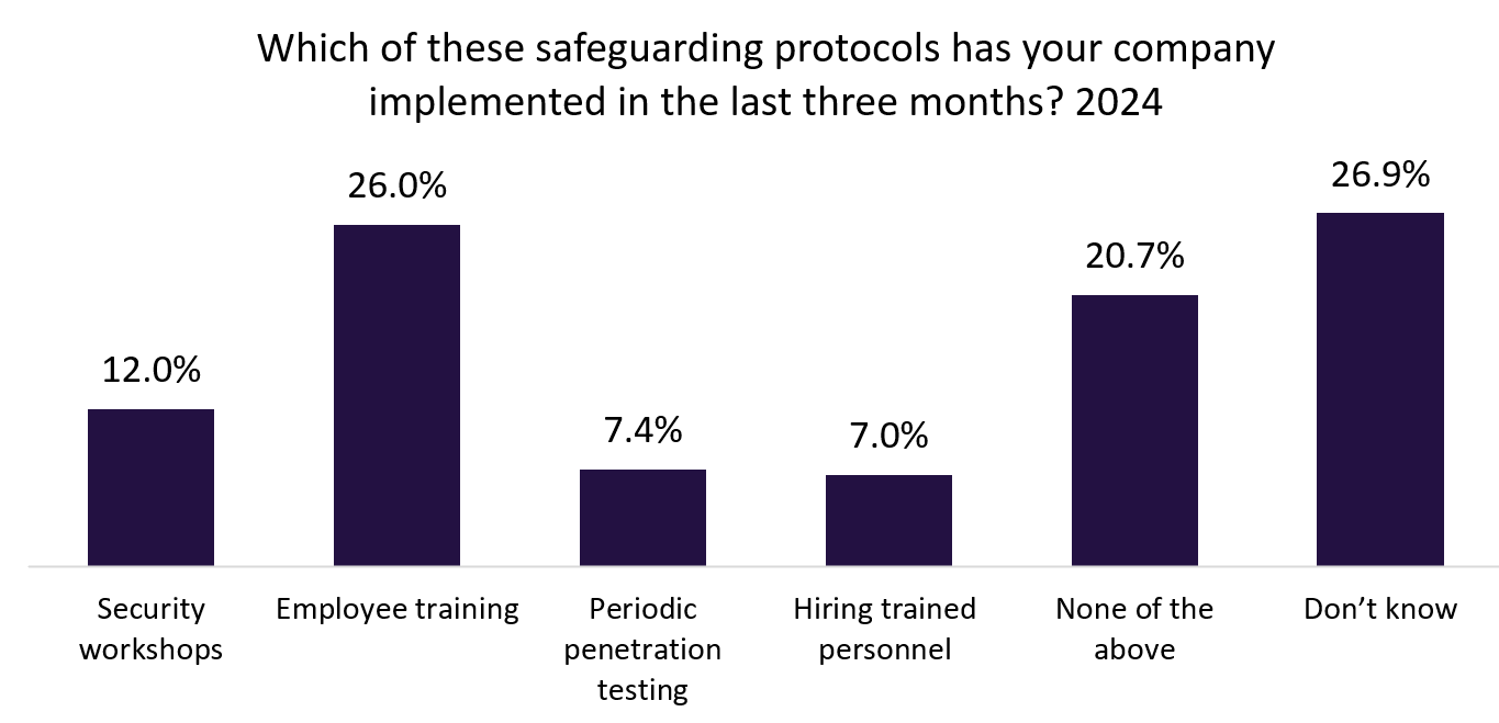 A GlobalData poll run on Verdict Media sites in Q4 2024 revealed that 26% of organisations have adopted employee training as a cybersecurity safeguarding protocol within the past three months. Additionally, 12% of companies reported implementing security workshops, 7.4% used periodic penetration testing, and 7% cited hiring trained personnel. Notably, a significant 20.7% of participants indicated that their organisations have not engaged in any of the aforementioned measures, suggesting a passive approach to the implementation of cybersecurity protocols.