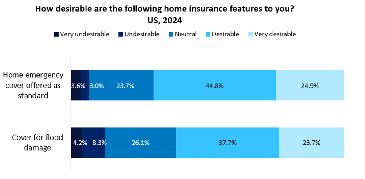As per GlobalData’s 2024 Emerging Trends Insurance Consumer Survey, an overwhelming 69.7% of US home insurance policyholders would find it desirable or very desirable to get home emergency cover as standard with their policy. Cover for flood damage is also highly desirable, with 61.4% of respondents viewing this favourably.