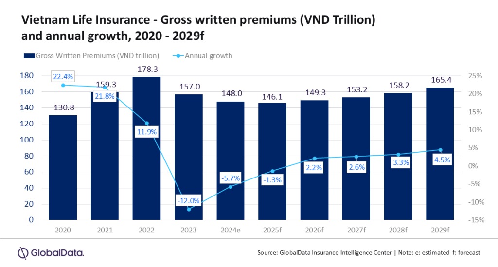 The life insurance sector in Vietnam is predicted to contract by 1.3% to VND146.1trn ($6bn) in 2025 from VND148trn ($6.1bn) in 2024, in terms of gross written premium.