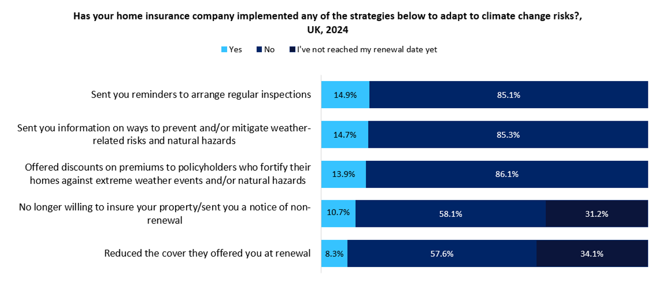 Only a small proportion of home insurance policyholders cite that their insurer has adopted strategies to address climate change risks as per a GlobalData survey. While insurers focus on improving risk assessments to more accurately price policies, more could be done to encourage customers to also take steps that could help mitigate risks and reduce the cost of claims.