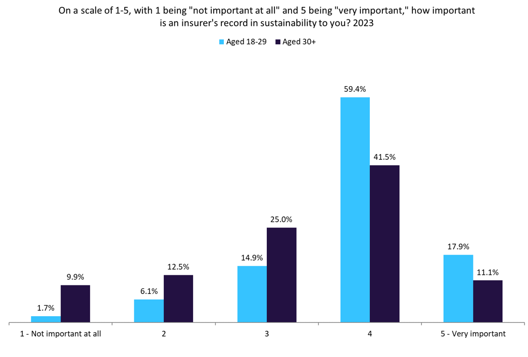 According to GlobalData’s 2023 UK Insurance Consumer Survey, consumers aged 18–29 prioritise insurers’ sustainability records more than older age groups. Specifically, 17.9% of those aged 18–29 consider sustainability to be very important, compared to only 11.1% of consumers aged 30 and above. Additionally, just 1.7% of consumers aged 18–29 view this issue as unimportant, compared to 9.9% of individuals aged 30 and above.